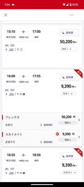 15:10発の便は「残席2」と表示されていますが、料金が50,200円と明らかにフレックスのものです。この場合、フレックス運賃では予約できるがスカイメイトでは予約できないということです。